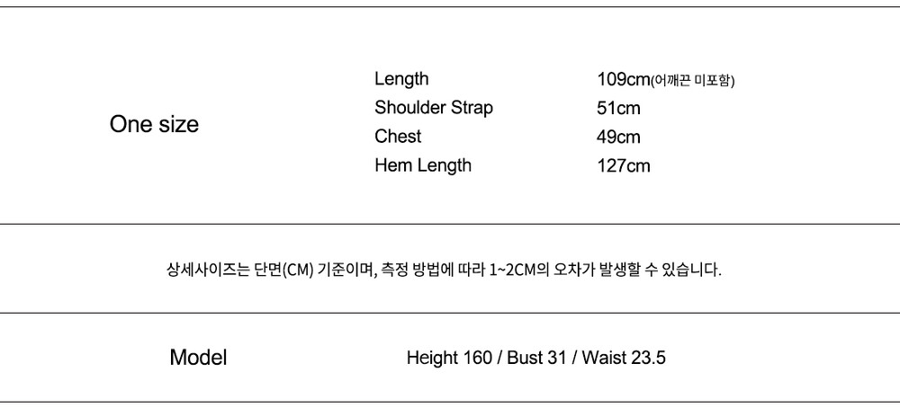 총장 : 109cm (어깨끈 미포함) / 어깨끈 : 51cm / 가슴 : 49cm / 밑단 : 127cm