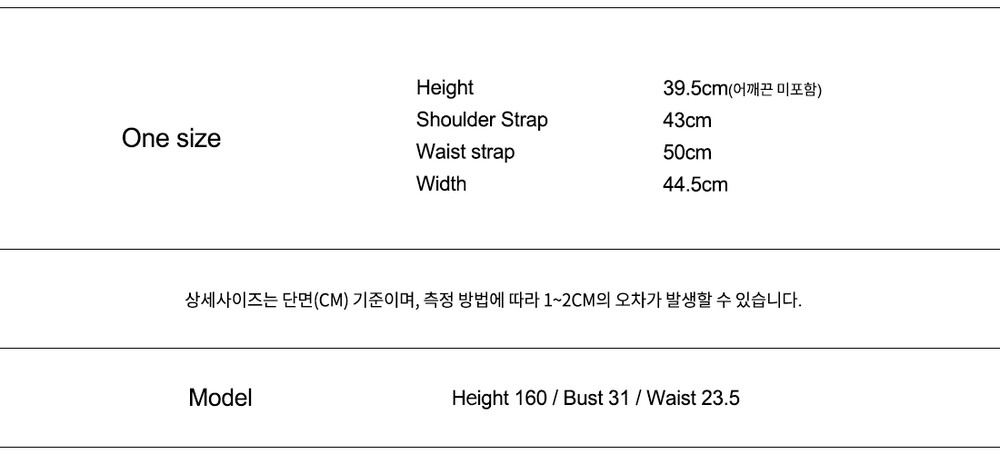 높이: 39.5cm (어깨끈 미포함) / 어깨끈 : 43cm / 허리스트랩 : 50cm /
